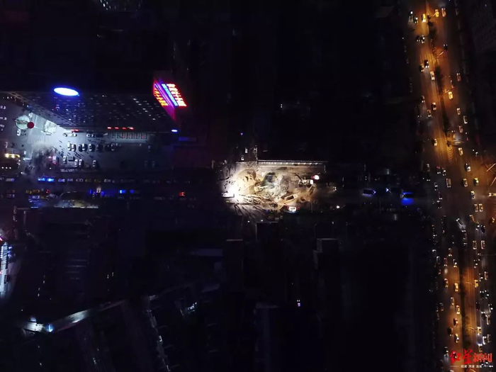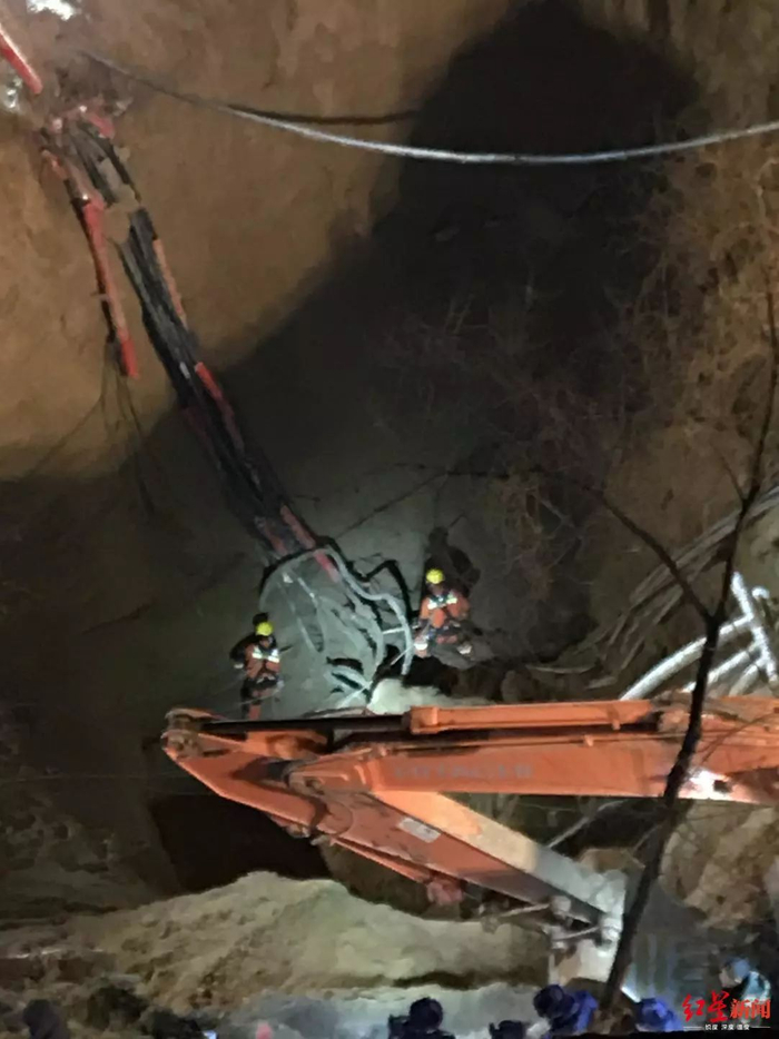 1月14日晚,红星新闻记者来到事发现场,事发的南大街路段已经被封锁,车辆无法通过只得绕行。从事发现场旁边的大楼俯瞰,现场已经被挖成一个大坑,有一辆大吊车、两台挖掘机和多辆运土车在参与救援。深夜,现场温度降到零下几度,但是仍然有众多工作人员在救援,红星新闻记者可以清晰看到两名消防人员绑着绳子,下到坑底部。