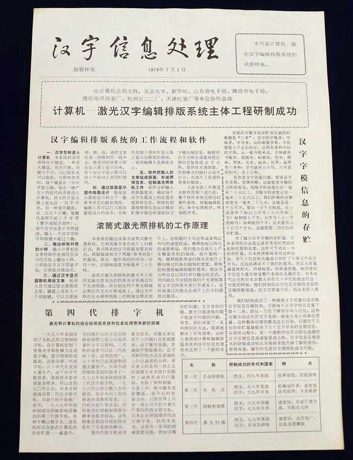 1979年7月27日,汉字激光照排系统输出的第一张报纸样张《汉字信息处理》,这是新中国第一张用“计算机-激光汉字编辑排版系统”整张输出的中文报纸。