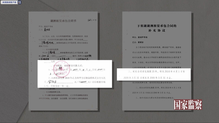 △ 2010年到2011年,两地湖洲管理部门与夏顺安违规续签了30年长期承包合同,并变更合同内容,允许其在此区域进行违规建设。