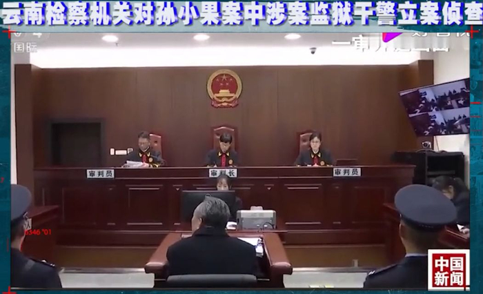 2019年12月15日,经检察机关提起公诉,涉孙小果案19名公职人员和重要关系人职务犯罪案公开宣判。其中,法院以徇私舞弊减刑罪,分别判处云南省监狱管理局安全环保处原处长王开贵有期徒刑五年零六个月、云南省第一监狱原督查专员贝虎跃有期徒刑三年、云南省第一监狱指挥中心原民警周忠平有期徒刑三年、云南省第二监狱十九监区原监区长文智深有期徒刑三年零六个月、云南省第二监狱医院原民警沈鲲有期徒刑三年零六个月、云南省官渡监狱原副政委杨松有期徒刑二年。