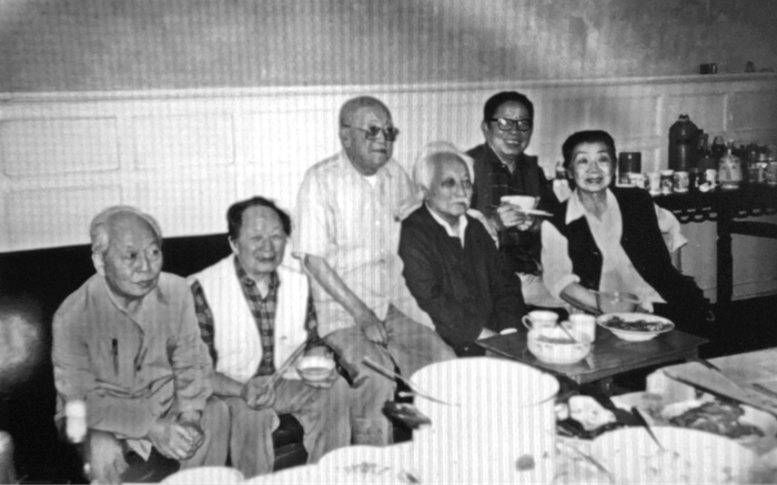 二十世纪九十年代初,“二流堂”的几位朋友在夏衍家中相聚。左起:吴祖光、黄苗子、唐瑜、叶浅予、丁聪、郁风。