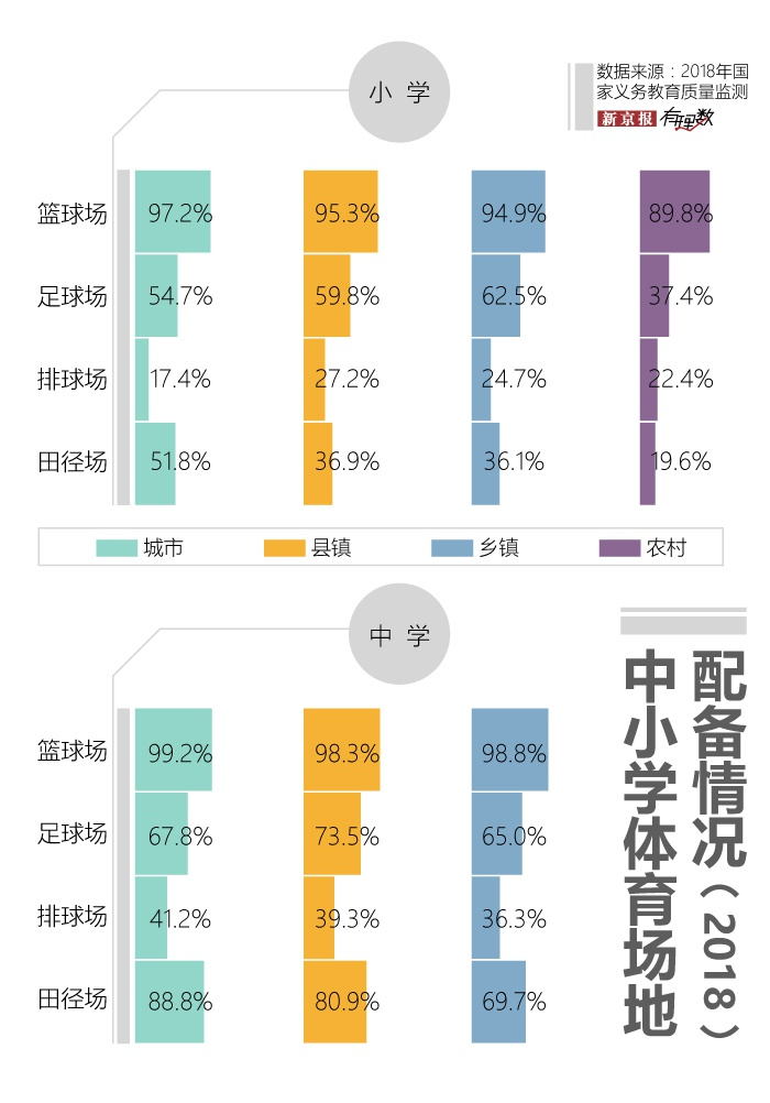 根据《2018年国家义务教育质量监测》,中小学体育场地配备目前仍存在不足,而且这种不足在场地类型和城乡分布上有很大差异。