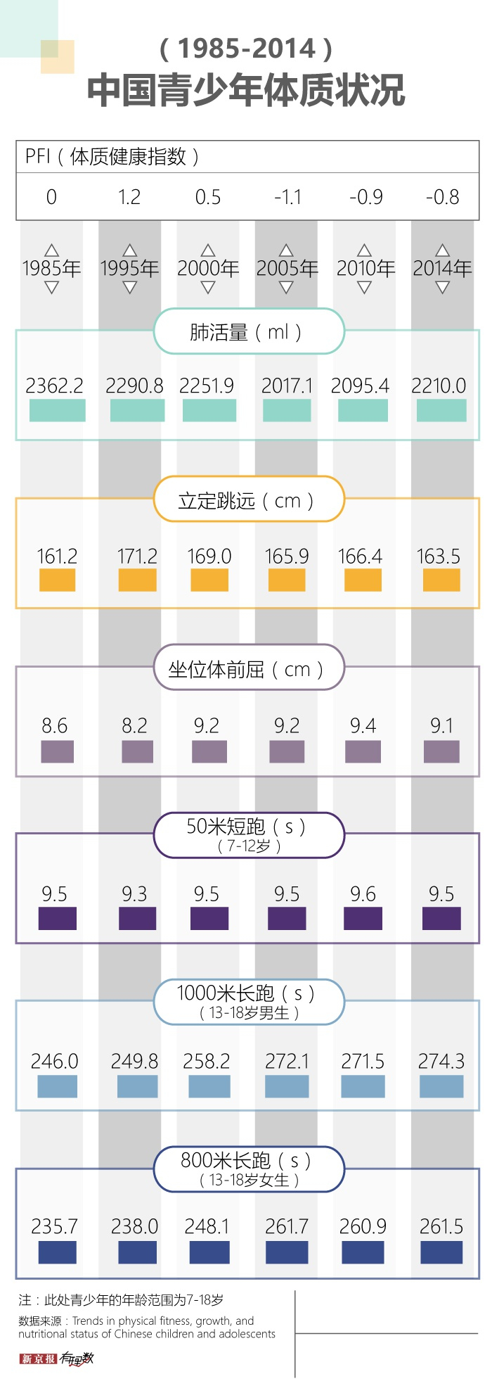 科研人员利用1985年至2014年间六次全国学生体质健康状况调查,将7-18岁儿童青少年的肺活量、立定跳远、坐位体前屈、肌肉力量、50米短跑和长跑成绩计算成体质健康指数(PFI)。