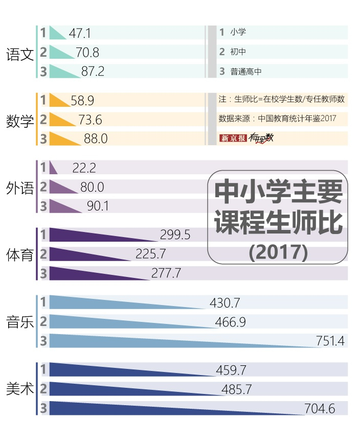 根据《中国教育统计年鉴2017》公布的中小学在校学生数和专任教师数,可计算出当年的生师比。计算结果显示,在小学阶段平均299.5名学生才拥有1位体育老师,小学体育老师数量还不到语文老师的六分之一。