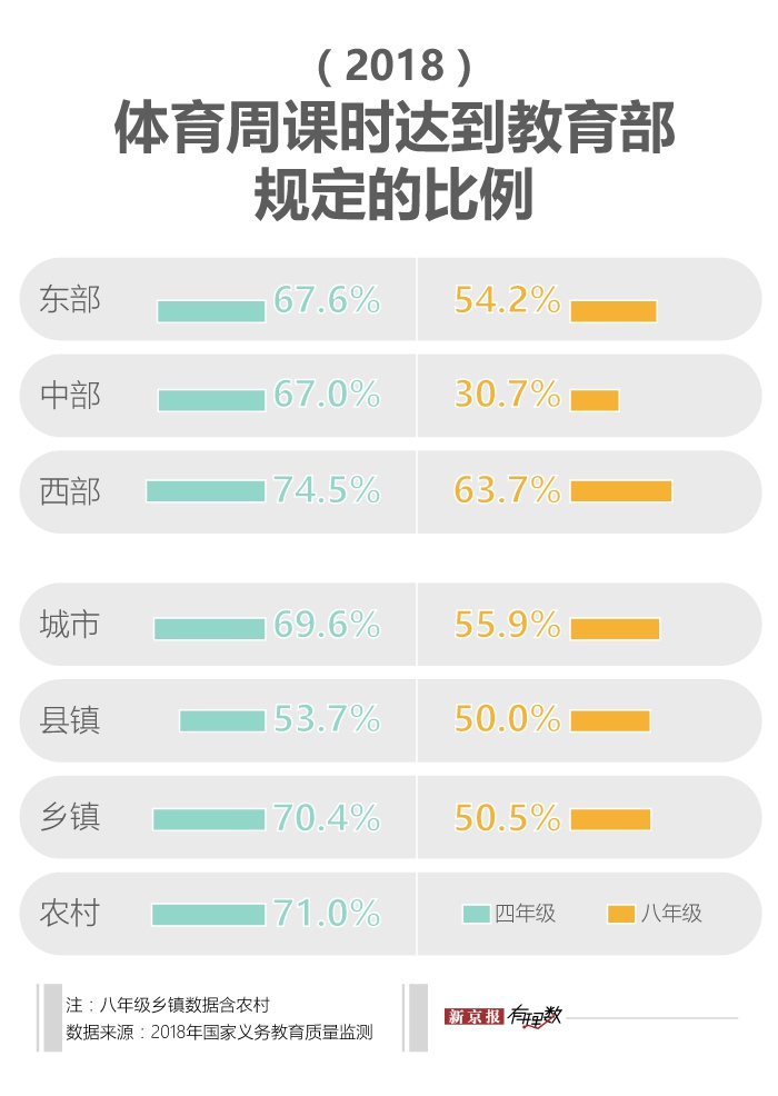 据2018年发布的《中国义务教育质量监测报告》,72.0%的学校四年级语文周课时数多于6节,44.3%的学校四年级体育周课时数少于3节;73.3%的学校八年级数学周课时数多于5节,60.8%的学校八年级体育周课时数少于3节。