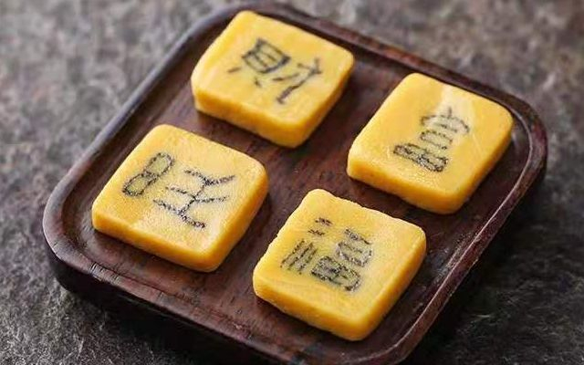 而这其中有颇为复杂的步骤。首先糖稀需要分别与磨好的黄豆粉和黑芝麻粉和匀,制成粉团切成一块块小“剂子”后,便需以黄豆剂子为纸,以黑芝麻剂子为笔,将要制作的汉字按照笔画拆解,用黑面和黄面镶嵌组成汉字的大小部分,再像搭积木一般,搭好每一笔纹路,而人们对于未来的美好祝福,似乎也能在这手工操作下的一笔一画融进字里。