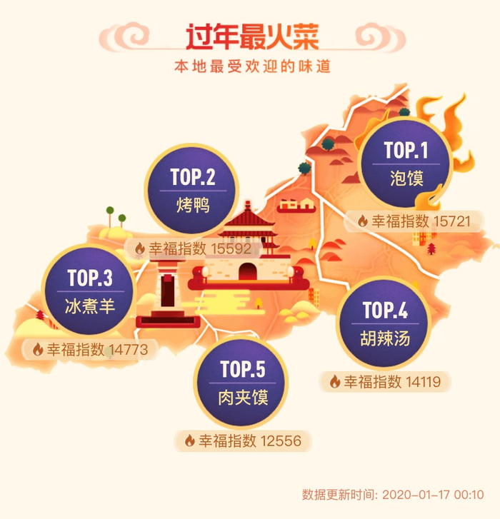 新京报讯(记者 欧阳晓娟)1月17日,大众点评2020“年味地图”上线。通过可视化实时大数据,用户可以一探大江南北饮食特色风貌。新京报记者注意到,烤鸭、椰子鸡、羊蝎子、酸菜鱼和猪肚鸡成为全国“过年最火菜”前五名,烤鸭则蝉联第一。