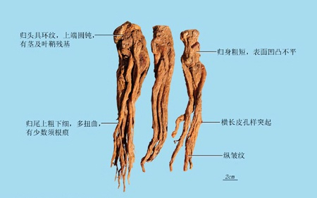 当归:全归长略呈圆柱形,下部有支根3~5条或更多,长15~25cm。补血活血,调经止痛,润肠通便。用于血虚萎黄、眩晕心悸、月经不调、经闭痛经、虚寒腹痛、肠燥便秘、风湿痹痛、跌扑损伤、痈疽疮疡。主产甘肃、云南、青海等地。