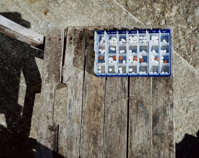 △ 装有每日必服药物的盒子,其中包括可以缓解疼痛的高剂量吗啡。