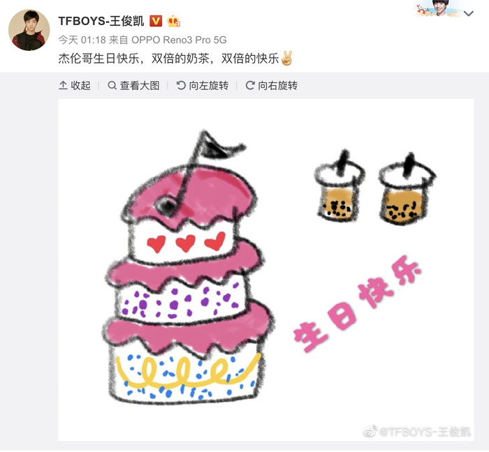 原标题:王俊凯发文为周杰伦庆生,送上手绘蛋糕和两杯奶茶