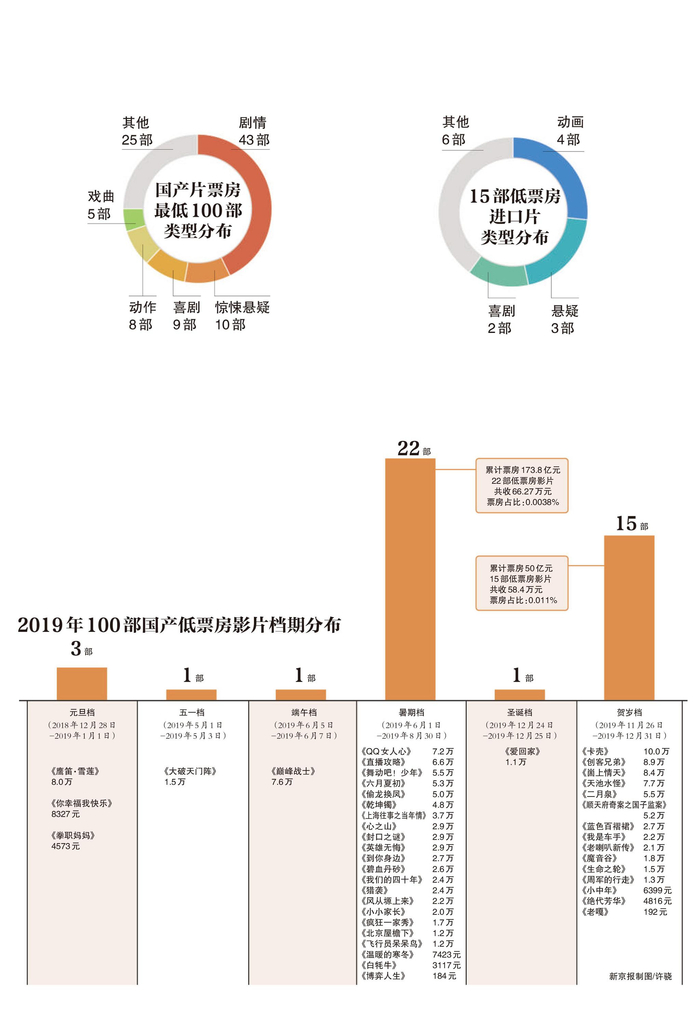 据新京报记者统计,刚刚过去的2019年,虽然全年总票房达到642.6亿元,但票房最低的100部国产片总票房仅有380万元,最低影片的票房仅184元;票房均低于100万元的引进片15部,总票房976.3万元,最低影片的票房仅21万元。记者采访票房专家和院线经理,揭秘超低票房影片的“搏一搏心态”和“档期投机”。