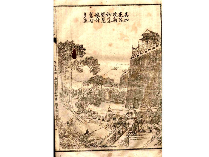《荡寇志》插图,梁山盗匪们使用洋军师白尔瓦罕制造的黑科技武器“奔雷车”与官军对战