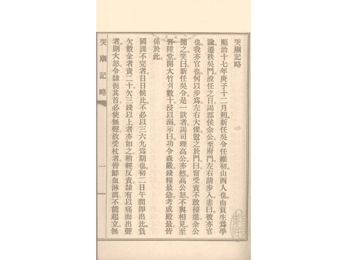 (上段英译的翻译与理解有不准确之处。《哭庙记略》原文为:“顺治十七年庚子十二月朔,新任吴令任维初,山西人也,由贡生为学谕,迁秩吴门。莅任之日,谒郡侯余公。至府门,左右请步入。恚曰:‘彼亦官也,我亦官也,何以步为?’左右惧,置之于门曰:‘宁受责,不敢抬进。’余公闻之笑曰:‘新任吴令是一呆者。’谒司理高公亦然。高公怒,不与相见。至署,升堂,开大竹片数十,浸以溺,示曰:‘功令森严,钱粮最急,考成殿最,皆系于此。’”——译者)
