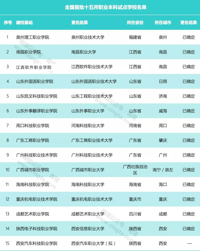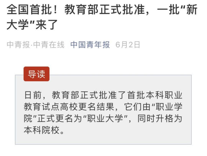 据报道,今年6月,教育部正式批准全国首批“职业大学”成立,15所职业院校不仅实现了更名“大学”,同时成为本科“职业大学”。