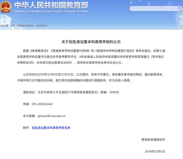 据中青报官微此前报道,教育部发展规划司2019年12月发布《关于拟批准设置本科高等学校的公示》。