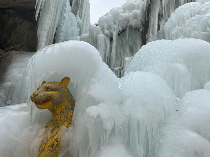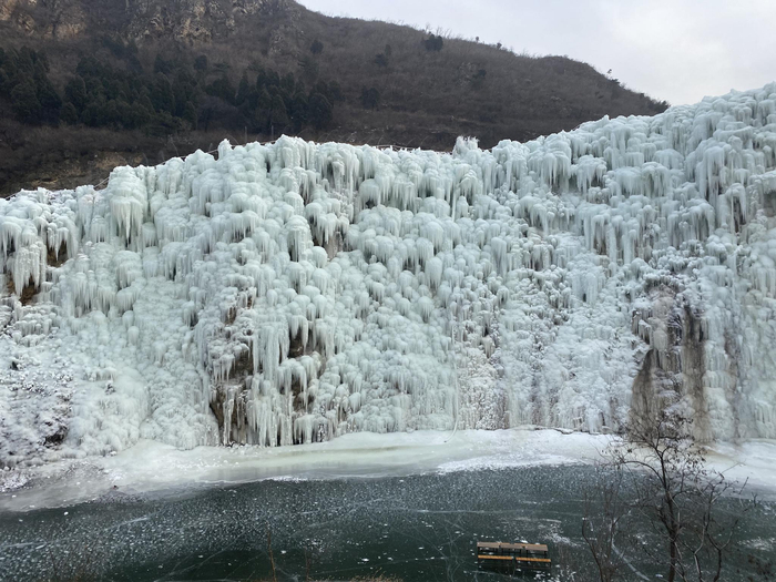 第二处观赏冰瀑的地点是水库旁的冰山,一整面大山银装素裹,仿佛像一幅冰雪山水画,煞是好看。天气较冷时,水库上的冰面会对游客开放,大家可走在上面,身后巨大的冰瀑笼罩着自己,感觉就像置身在冰雪王国里。冰面上还设有座椅,供大家拍照休息。这里也是景区内最为壮观、最佳观赏冰瀑的地点。