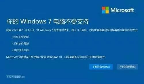微软Windows 7系统于1月14日停止更新,官方停止技术支持、软件更新和安全问题的修复。这意味着全球5亿台左右运行Windows 7系统的PC将被微软“抛弃”,处于排山倒海般的风险之下。