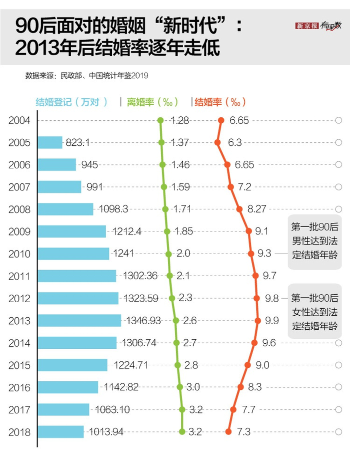 中国俗话说“男大当婚,女大当嫁”。到2012年第一批90后男孩达到法定结婚年龄,2017年最后一批90后成年,2020年第一批90后步入30岁。然而,从2013年起,中国结婚率就出现了持续下滑。