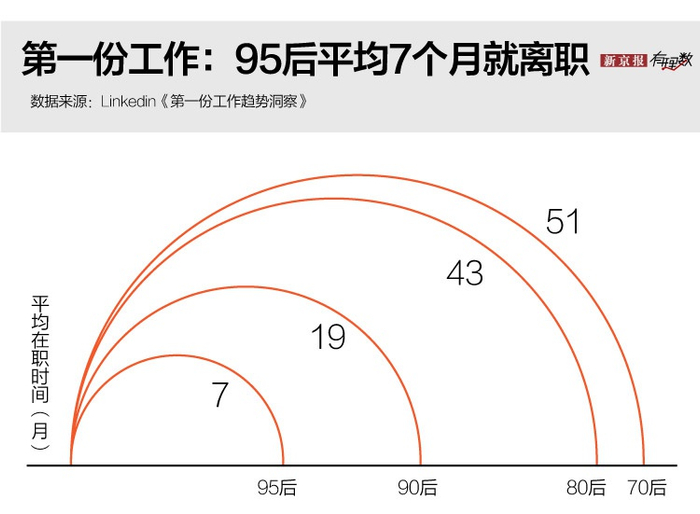根据领英2018年发布的《第一份工作趋势洞察》报告,95后第一份工作在职时间平均仅为7个月,90后第一份工作的平均在职时间为19个月,远低于70后、80后群体。