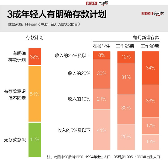 尼尔森市场研究公司2019年9-10月对中国各线城市的3036名18-29岁消费者在线调查,32%的年轻人表示有明确的存款计划,且随着年龄和阅历的增长,每月新增存款比例也有明显提升。