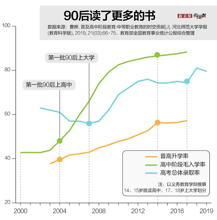 与人口数量规模减少相反的是,90后的受教育规模和程度则要远高于前面几代人。第一批90后出生的那一年,全国高中阶段毛入学率为21.9%,高考总体录取率为22%;而当最后一批90后面对中考、高考时,上述数字已分别达到了86%和75%。