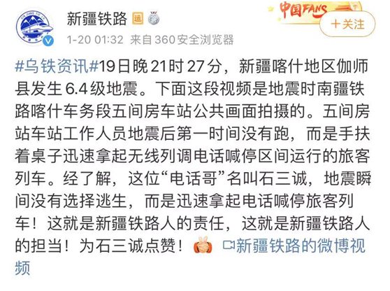 喀什强震来袭瞬间他没跑 拿起电话喊停列车