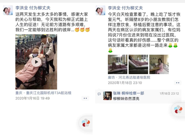 经过多方打听后,1月17日凌晨三点多,付为柳在丈夫李洪全和弟弟付家浩的陪伴下,来到了位于河北燕郊的燕达陆道培医院,准备在此进行化疗和骨髓移植。这是一家知名的血液病专科医院,方圆几公里内租住着大量的白血病病友。李洪全很快就被拉进了“抗白家园新战友”“小白加油”等微信互助群,病友家属们非常团结,指点各种注意事项、租房需求等等。17日晚上,付为柳的弟弟借住在一位山东病友的出租屋里,李洪全开始全天24小时在病房内陪护。