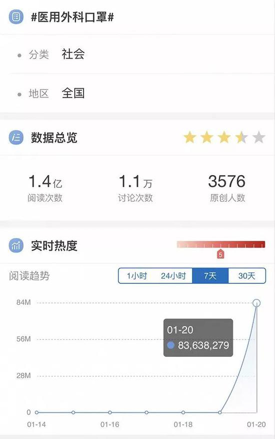 医用外科口罩在微博上的阅读趋势短期内暴增。