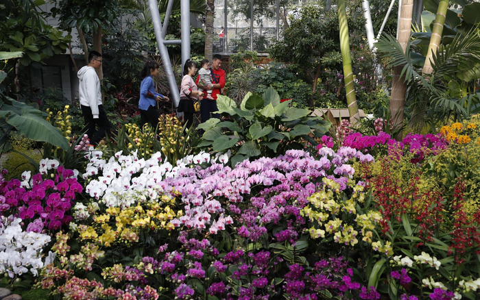 记者今天在现场看到,热带展览温室内以花球、灯笼装饰一新,园艺师们正在布展。在六处主要景点,园艺师们用不同种类的兰花、凤梨、海棠,辅以流水、喷雾等景观,从不同层面展现兰花之美。特别是兰韵飞瀑景区,利用地形优势,营造出自上而下的水雾效果,形成山涧兰花绽放,树木苔痕幽绿,水面云雾环绕的意境,吸引了不少游客拍照“打卡”。