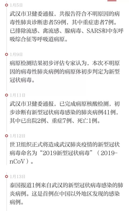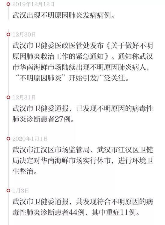 1月21日下午,武汉市宣布,继续加大华南海鲜批发市场休市后管控力度,24小时管控市场及其周边出入口。加大农(集)贸市场及各类经营场所排查,开展卫生学调查和流行病学调查,对发现病例集中隔离治疗,对密切接触者进行医学观察。