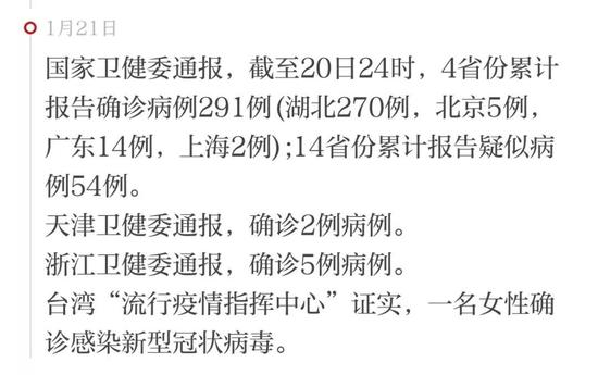 据国家卫建委消息,截至1月20日24时,累计报告新型冠状病毒感染的肺炎确诊病例291例,其中湖北省270例,北京市5例,广东省14例,上海市2例,四川、云南等14省累计报告疑似病例54例。