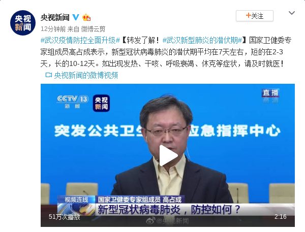 原标题:转发了解!武汉新型肺炎的潜伏期