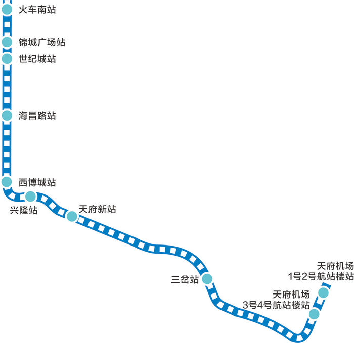 18号线全长68.9公里,设车辆段1座、车站13座(含机场代建的两座车站:天府机场1号2号航站楼站和机场北站),全线铺轨170.1公里、铺道岔116组。