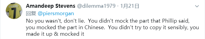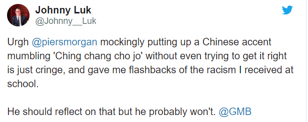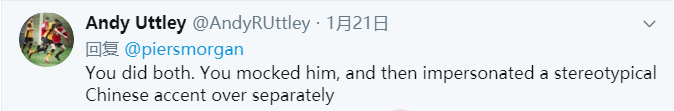 还有推特网友表示,摩根胡乱模仿中文口音,让自己回想起在学校受到的种族歧视,网友还劝他“应该反思一下”。