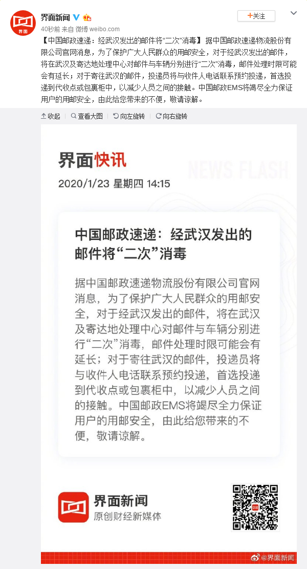 原标题:中国邮政速递:经武汉发出的邮件将“二次”消毒
