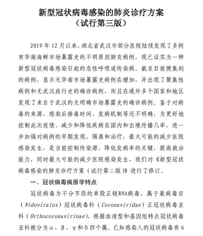 1月23日,国家卫健委公布《新型冠状病毒感染的肺炎诊疗方案(试行第三版)》。《方案》显示:截至目前搜集到的病例,显示无华南海鲜市场暴露病史病例在增加,并出现了聚集性病例和无武汉旅行史的确诊病例,而且在境外多个国家和地区发现了来自于武汉的无明确市场暴露史的确诊病例。方案全文如下:
