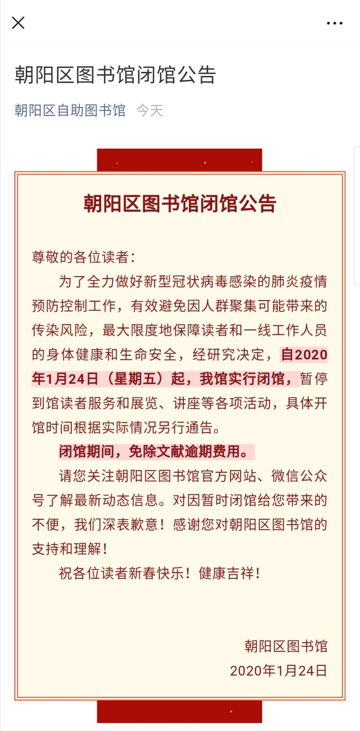 新京报快讯(记者 马瑾倩)朝阳区图书馆官方微信1月24日发布公告称,为了全力做好新型冠状病毒感染的肺炎疫情预防控制工作,有效避免因人群聚集可能带来的传染风险,最大限度地保障读者和一线工作人员的身体健康和生命安全,经研究决定,自2020年1月24日(星期五)起,我馆实行闭馆,暂停到馆读者服务和展览、讲座等各项活动,具体开馆时间根据实际情况另行通告。