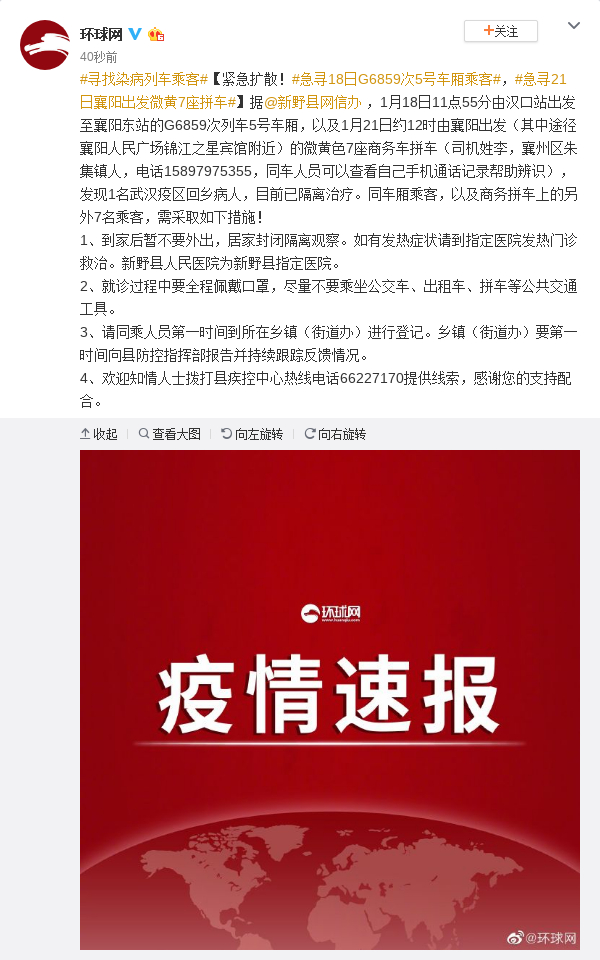据@新野县网信办 ,1月18日11点55分由汉口站出发至襄阳东站的G6859次列车5号车厢,以及1月21日约12时由襄阳出发(其中途径襄阳人民广场锦江之星宾馆附近)的微黄色7座商务车拼车(司机姓李,襄州区朱集镇人,电话15897975355,同车人员可以查看自己手机通话记录帮助辨识),发现1名武汉疫区回乡病人,目前已隔离治疗。同车厢乘客,以及商务拼车上的另外7名乘客,需采取如下措施!