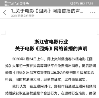 24日下午,一份“浙江省电影行业关于电影《囧妈》网络首播的声明”在网络上流转,多位影院工作人员转发。
