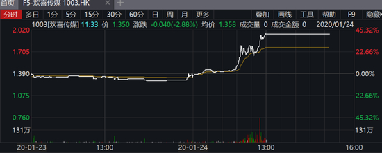 受此消息影响,港股欢喜传媒直线拉升,大涨43.07%,报1.96港元。