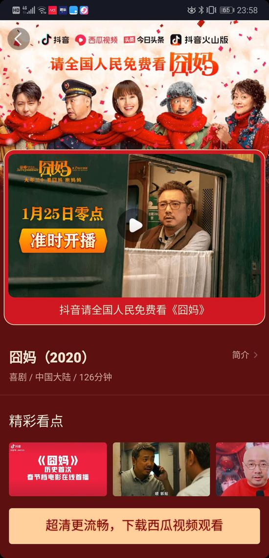 抖音和西瓜视频相关负责人告诉每日经济新闻(微信号:nbdnews)记者,“近年来春节看电影也成为大家的一个年俗。今年因为疫情原因,春节档电影都宣布撤档。我们此前与囧妈的出品方欢喜传媒就有合作。昨天《囧妈》撤档后,抖音和西瓜视频相关负责人找到电影出品方欢喜传媒,促成了这部贺岁电影仍然在大年初一,通过网络渠道,与观众见面。”