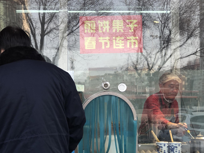 “嘛的?”“馃箅儿的。”大爷弯着腰,脑袋歪着凑到餐车的窗口里,拉开提到脖子下面的拉链,从黑色羽绒服的内兜里掏出两个鸡蛋,“俩鸡蛋的。”