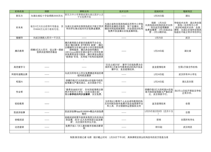 1月26日,好未来教育集团宣布设立1亿元抗击疫情专项基金。其中,8000万元用于教育专项,“最大程度帮助湖北及全国疫情地区的孩子们‘停课不停学’。”记者了解到,好未来为湖北全省和全国其他疫区不能正常开学的学生推出校内同步免费直播课,新东方则将中小学寒春班课向湖北医护人员子女免费开放。