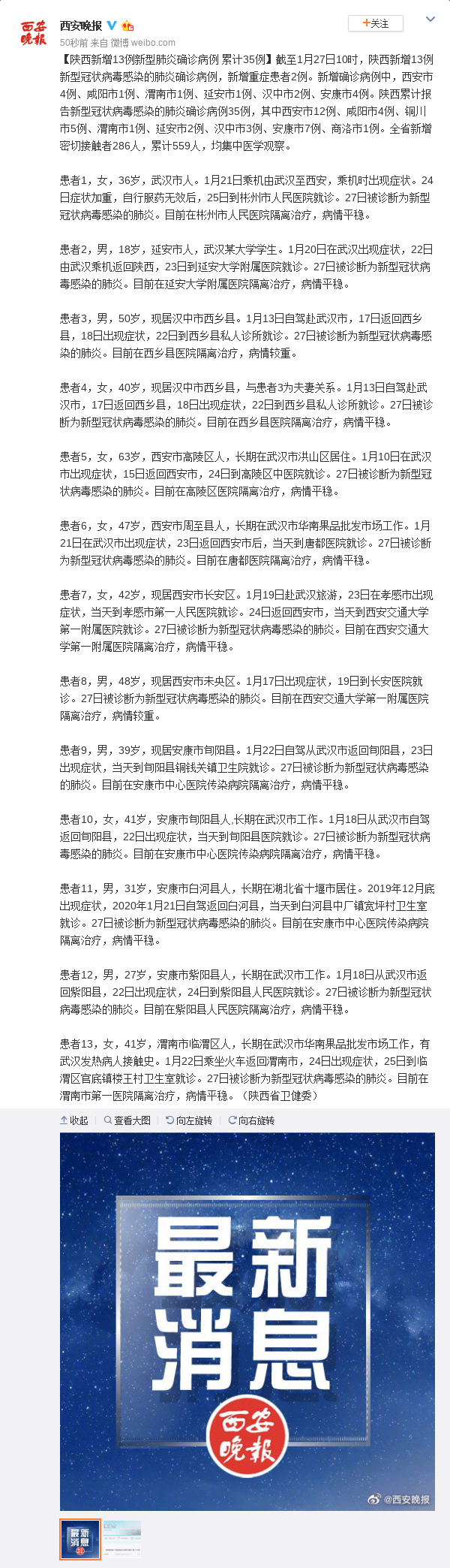 原标题:陕西新增13例新型肺炎确诊病例 累计35例