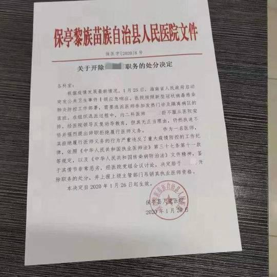 原标题:疑因拒绝值班发热门诊和隔离区 海南一医生被医院开除