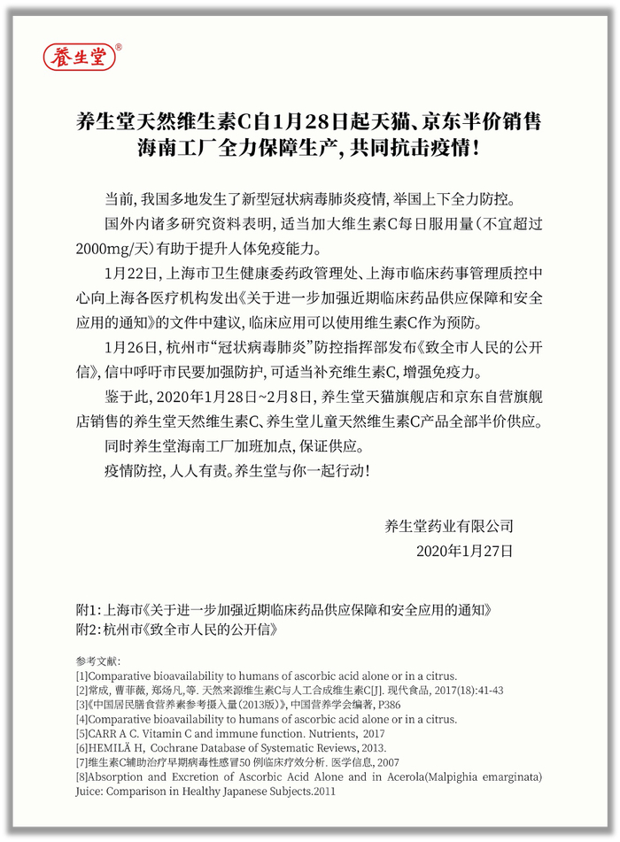 新京报讯(记者 王子扬)1月27日,养生堂药业有限公司宣布向武汉疫情区工作人员免费提供养生堂天然维生素C,无条件开放武汉所有库存直到耗尽。