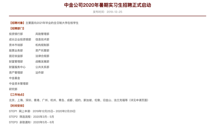 “贵族投行”中金公司的暑期实习招聘工作也于2019年12月底正式启动,根据公告,招聘对象主要为2021年毕业的全日制大学在校生,招聘部门包括:投资银行部、风险管理部、成长企业投资银部、信息技术部、资本市场部、机构规制部、股票业务部、资产托管部、固定收益部、法律合规部、财富管理部、财富服务中心、战略发展部、公共关系部、资产管理部、运作部、中金基金、中金资本管理部、研究部。