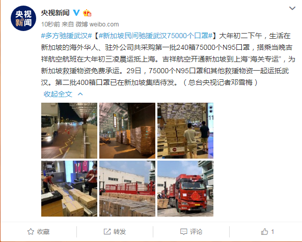 新加坡民间驰援武汉75000个口罩