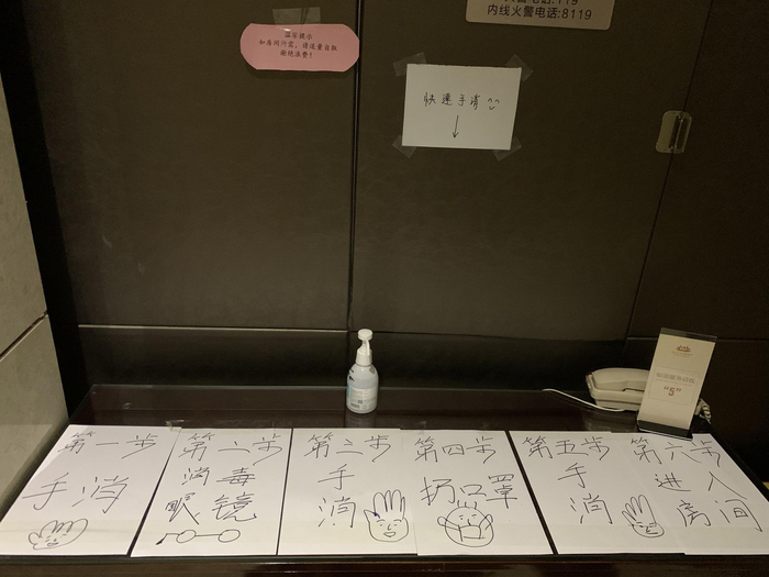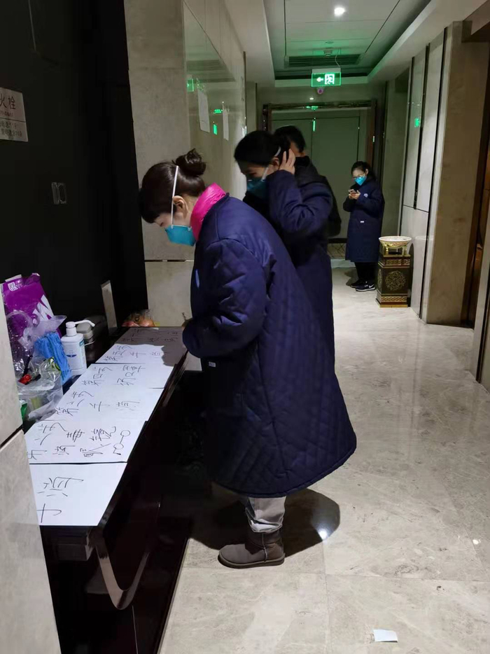 第一批队员进驻病房,第二批队员规划制定生活区防疫流程及标识。