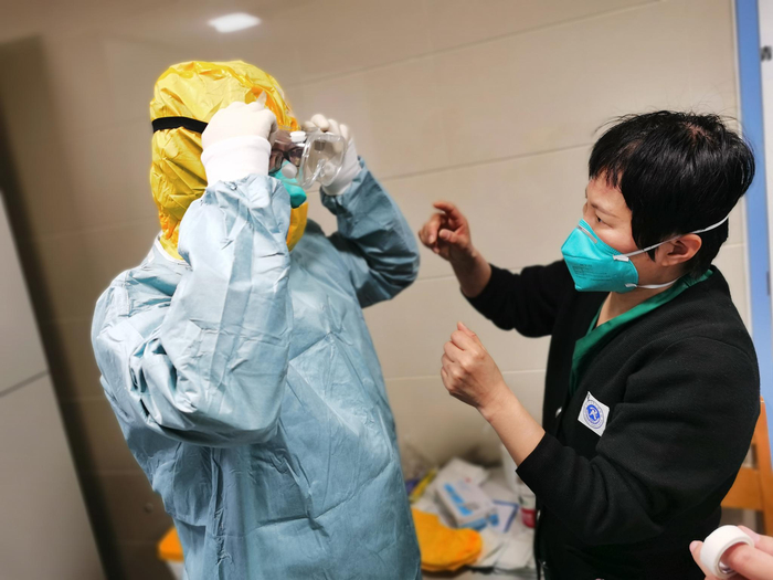 门诊部护士长王秋在帮助北医三院进入病房的医护人员检查防护是否到位。